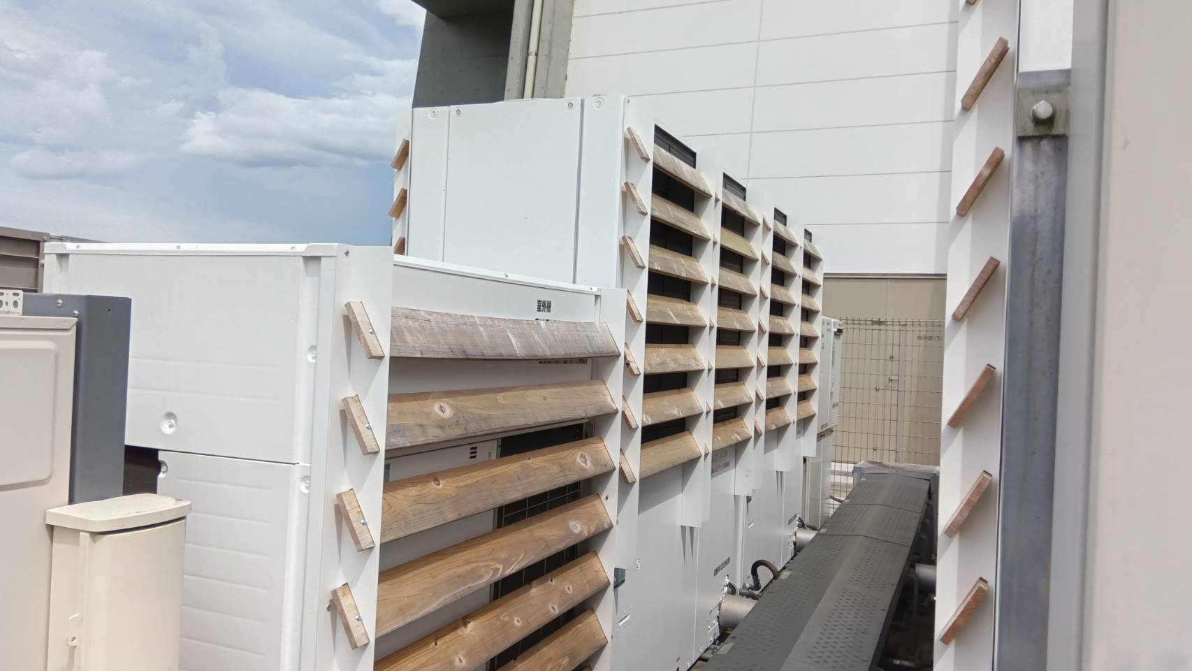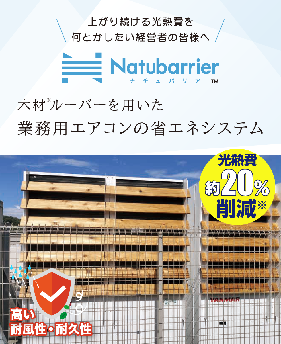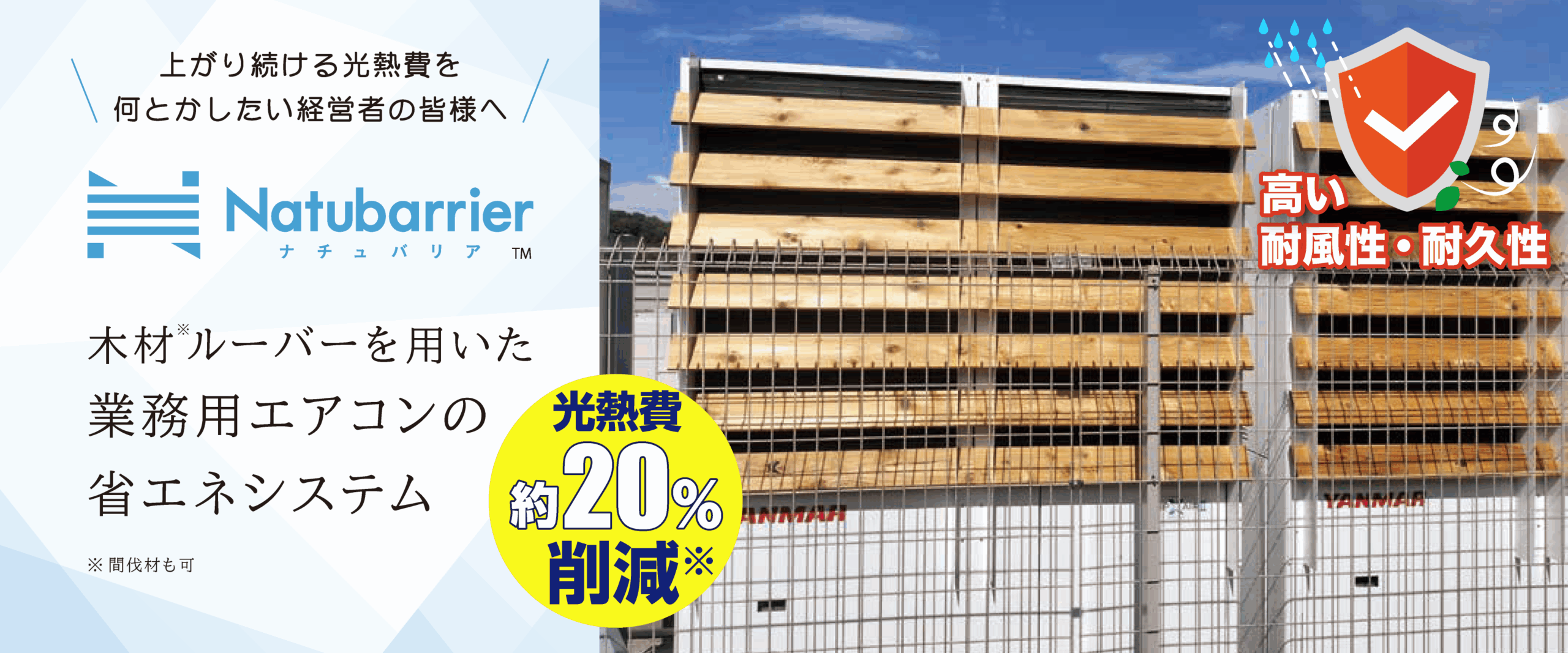 約20年前、当社は「業務用エアコンの省エネ」に着目し、遮熱ネットを用いたシステムを開発。炎天下の室外機を覆うことで外気温を数度下げ、最大20%の光熱費削減を実現しました。地元ホテルでの導入実績がメディアに取り上げられたことを機に、行政機関や企業にも採用が拡大しました。さらに、強風や台風による課題を解決するため、約10年前には鉄製ルーバーと遮熱塗料を組み合わせた新型システムを開発。現在では、環境保全をより強化するため、木材(間伐材も可)ルーバーを用いた新モデルを展開しています。これにより、省エネによるCO2削減に加え、森林保護にも貢献できる仕組みを実現しました。