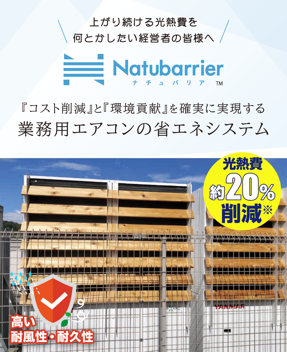 業務用エアコン省エネシステム「ナチュバリア」は、上がり続ける光熱費の削減を実現します。