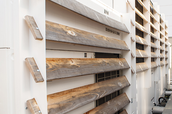 ナチュバリアはルーバーによる日陰効果で室外機への直射日光を遮ります。さらに遮熱塗料の断熱効果により、室外機自体の温度上昇を抑制。これらの相乗効果によりエアコンの熱効率を高めます。さらに、2022年からは木材を利用した新型ルーバーシステムを開発し、持続可能な社会への貢献も目指しています。